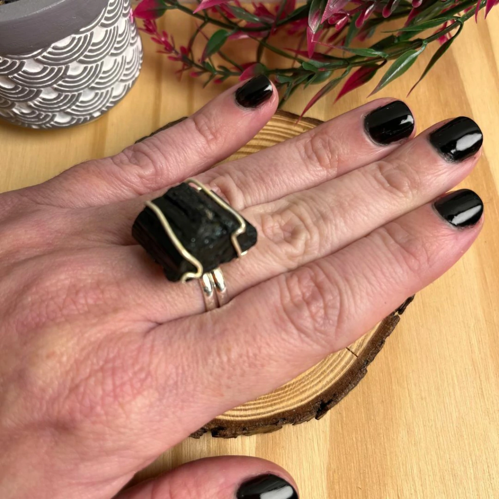 A Turmalina Negra é conhecida por absorver e transmutar energias densas, criar um campo protetor ao redor do corpo e trazer segurança emocional. Um anel que não é só acessório — é escudo, é ferramenta e é presença.