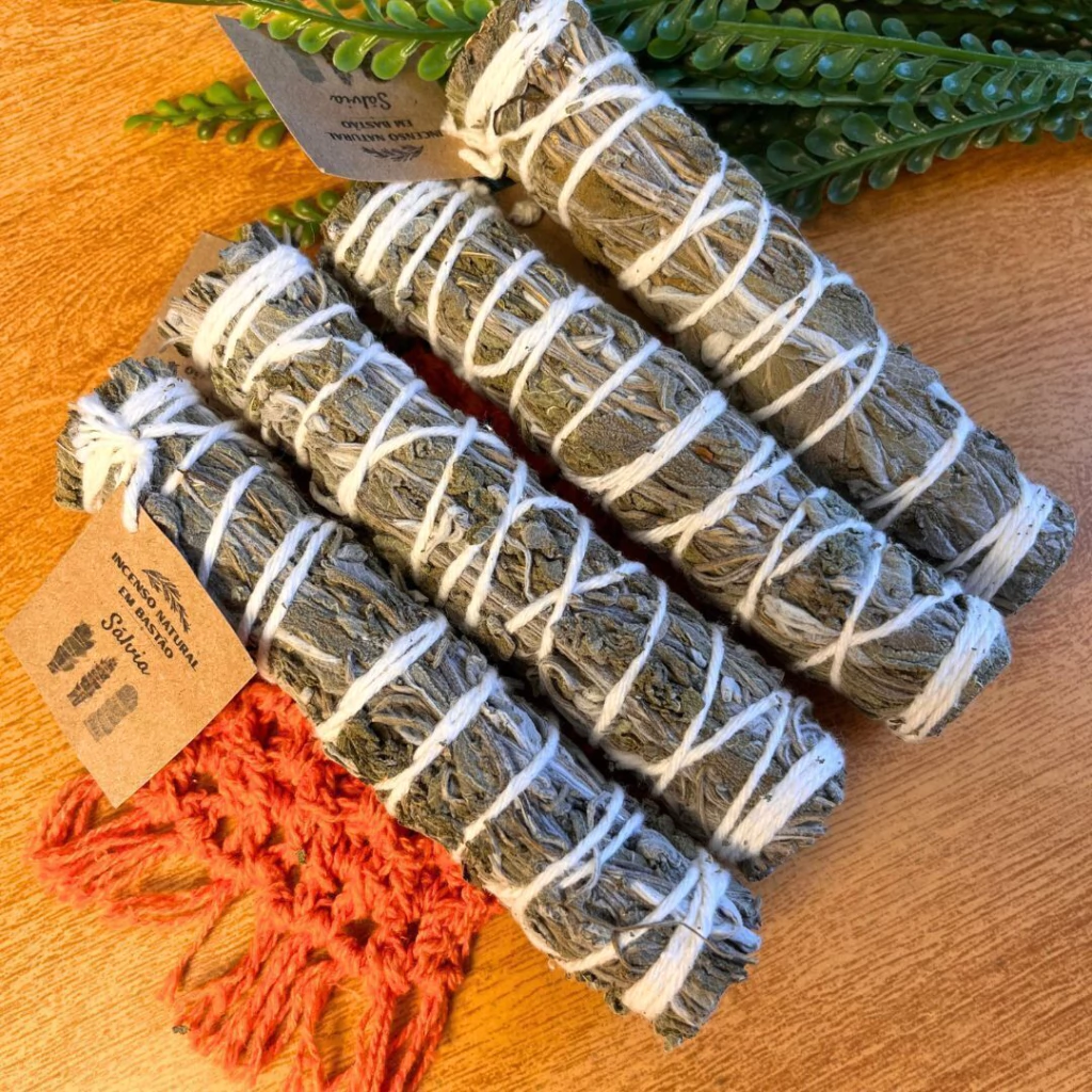 Bastão de Sálvia feito com Salvia Officinalis, conhecida popularmente por Sálvia Branca ou Sálvia Mística, cultivada no Brasil e usada há séculos em toda a Europa e no Mediterrâneo para defumação, purificação e rituais de cura.