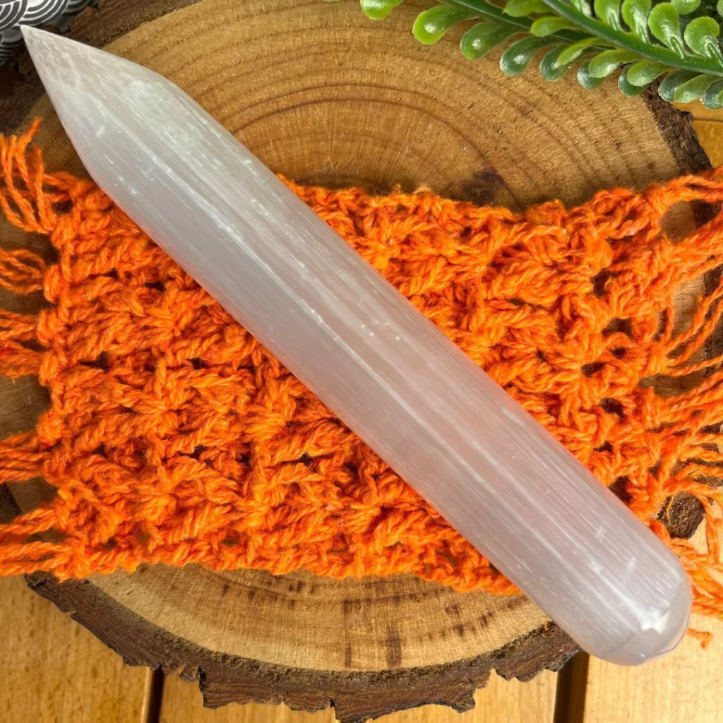 A Selenita purifica, protege e eleva a energia. Ela não acumula energia negativa e vibra alto o tempo todo — com esse bastão, sua luz se expande com ainda mais potência.