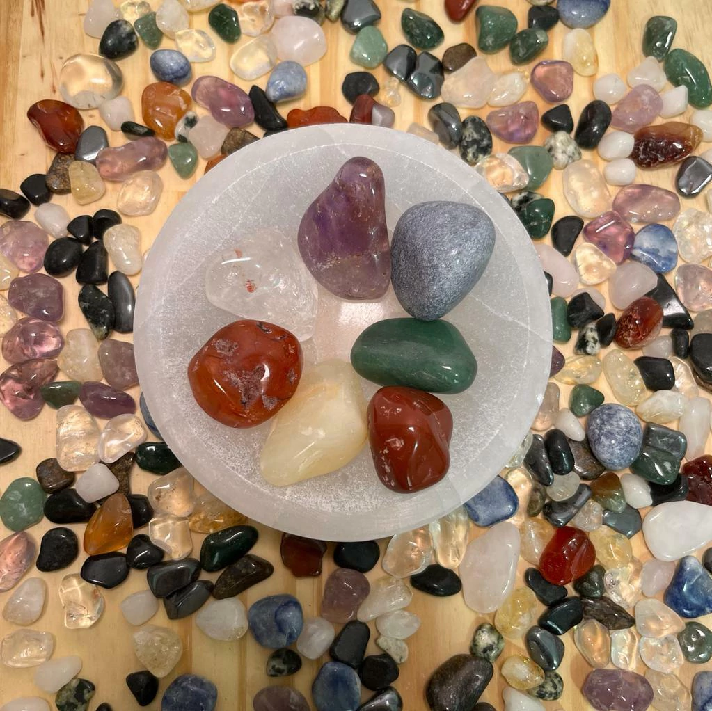 Para limpar outras pedras, basta deixar as pedras na Tigela de Selenita por no mínimo 1 hora. Quanto maior a pedra, mais tempo será necessário para que a energia de purificação seja totalmente absorvida e a limpeza seja completa.