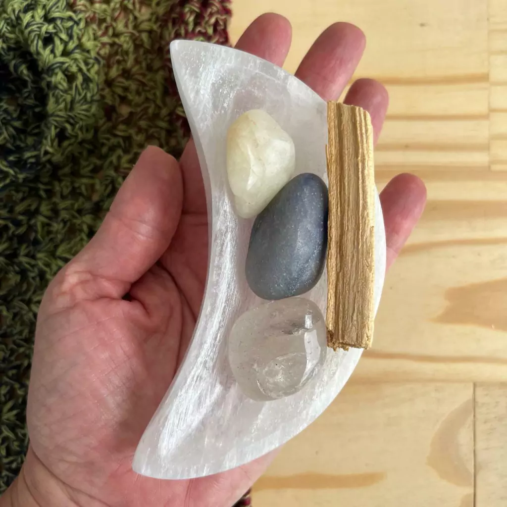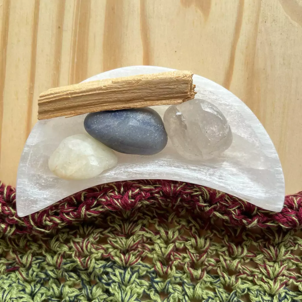 Tigela de Selenita Meia Lua, Cristal com Enxofre, Quartzo Azul, Quartzo Transparente e Palo Santo.