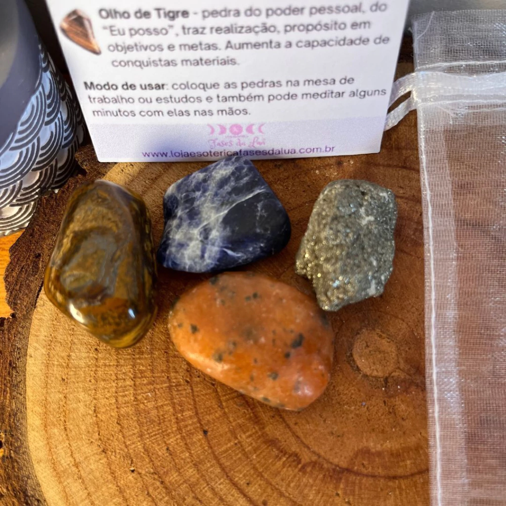A combinação das quatro pedras cria uma sinergia poderosa: a Sodalita organiza os pensamentos e traz racionalidade; a Calcita Laranja ativa a motivação e desperta o brilho interno; o Olho de Tigre impulsiona coragem, foco e ação estratégica; e a Pirita aumenta a vitalidade, a produtividade e o senso de propósito. Juntas, essas energias se potencializam, gerando um campo vibracional que sustenta concentração profunda, clareza e performance com equilíbrio. É aquele combo certeiro para quem quer produzir mais, sem perder o bem-estar.