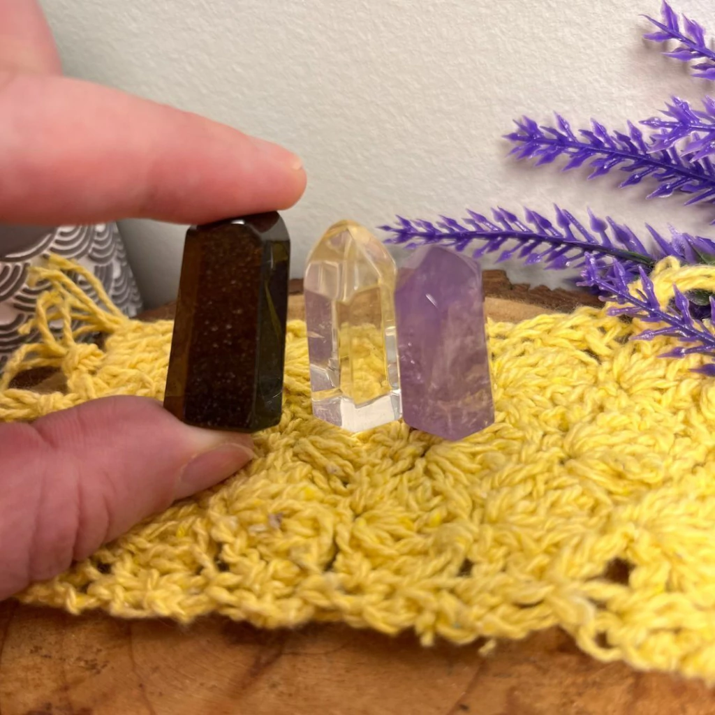 1 ponta de obsidiana, 1 ponta de olho de tigre e 1 ponta de quartzo azul