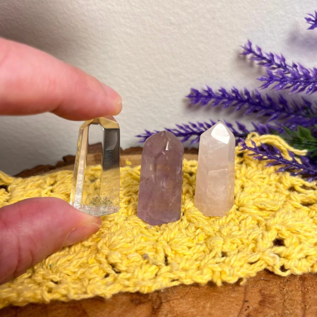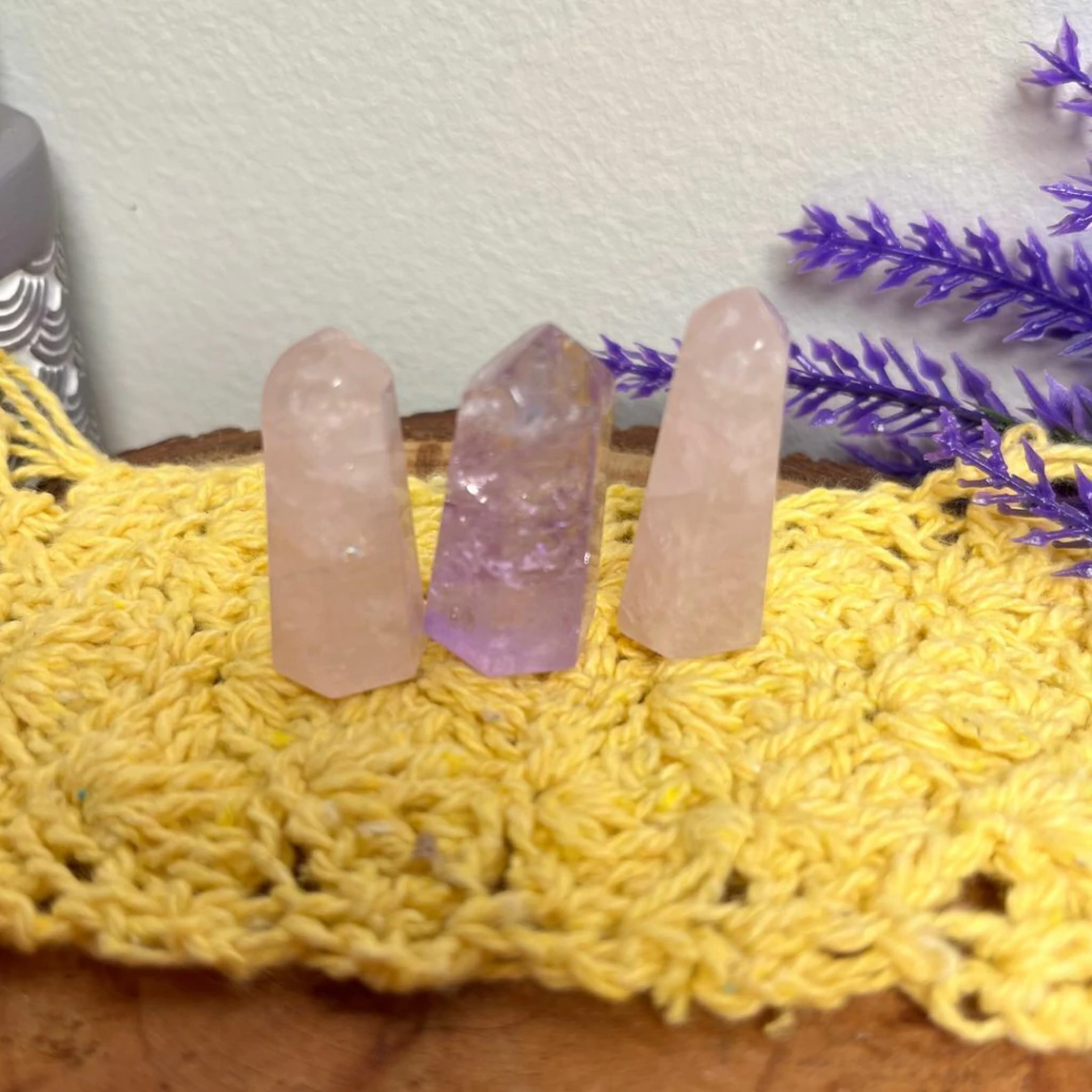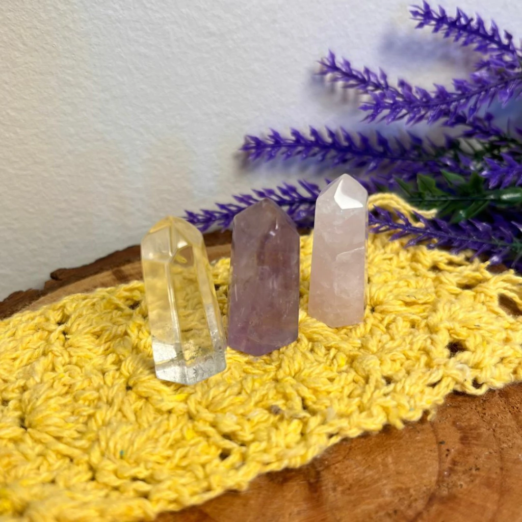 1 ponta de ametista, 1 ponta de cristal e 1 ponta de quartzo rosa