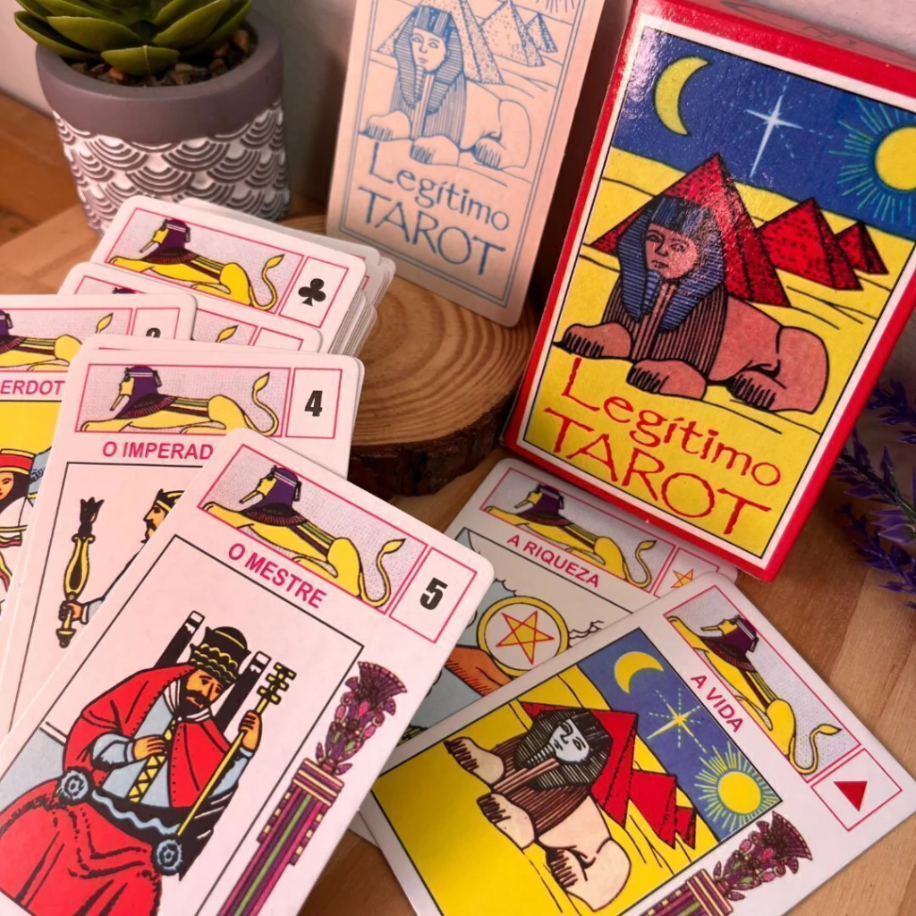Um tarot direto, simbólico e essencial. O Legítimo Tarot é um baralho com 40 cartas, composto pelos 22 Arcanos Maiores, 16 cartas dos Arcanos Menores (naipes representados por Rei, Rainha, Valete e Ás) e mais 2 cartas extras que simbolizam Riqueza e Vida — elementos que tornam esse deck único e poderoso.