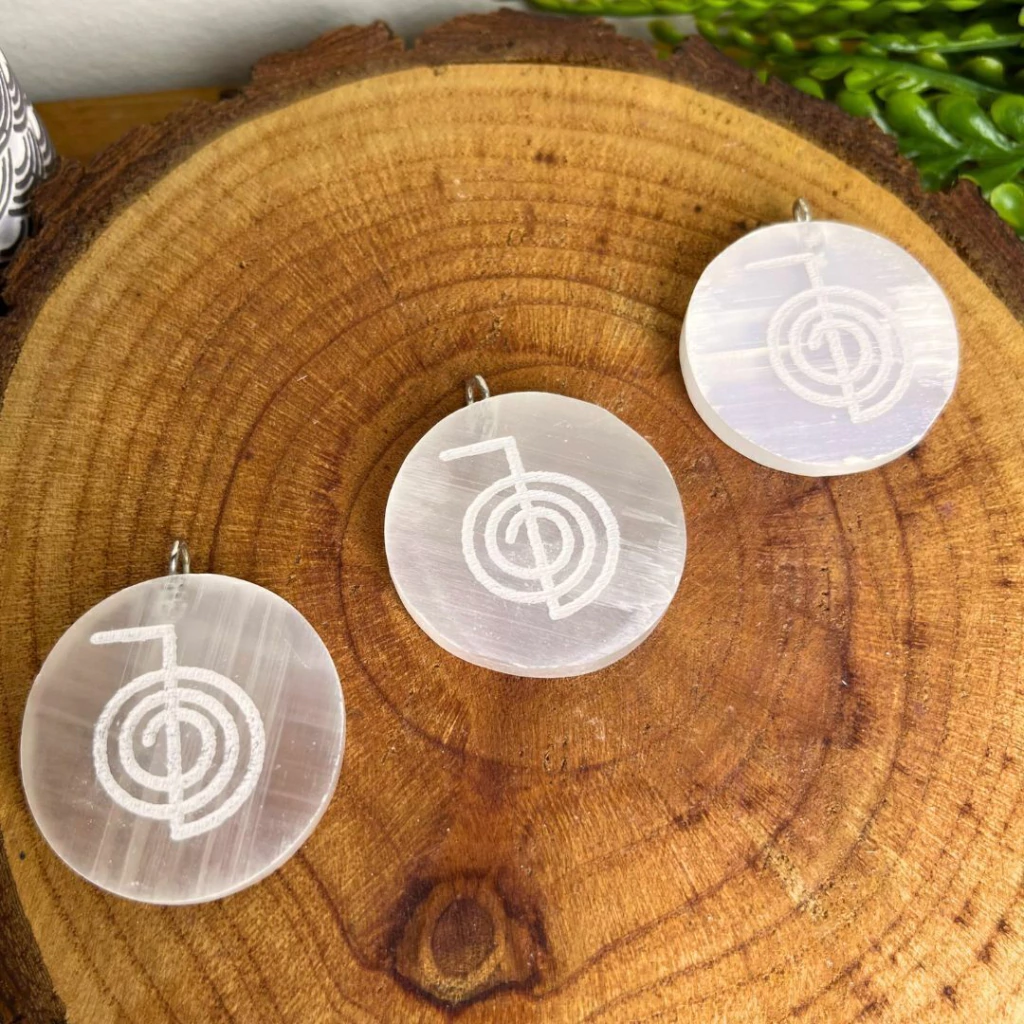 Um amuleto de luz e poder energético. A Selenita Branca é conhecida por sua capacidade de purificar, proteger e elevar a vibração espiritual — e quando unida ao símbolo Chokurei, do Reiki, essa força é amplificada.