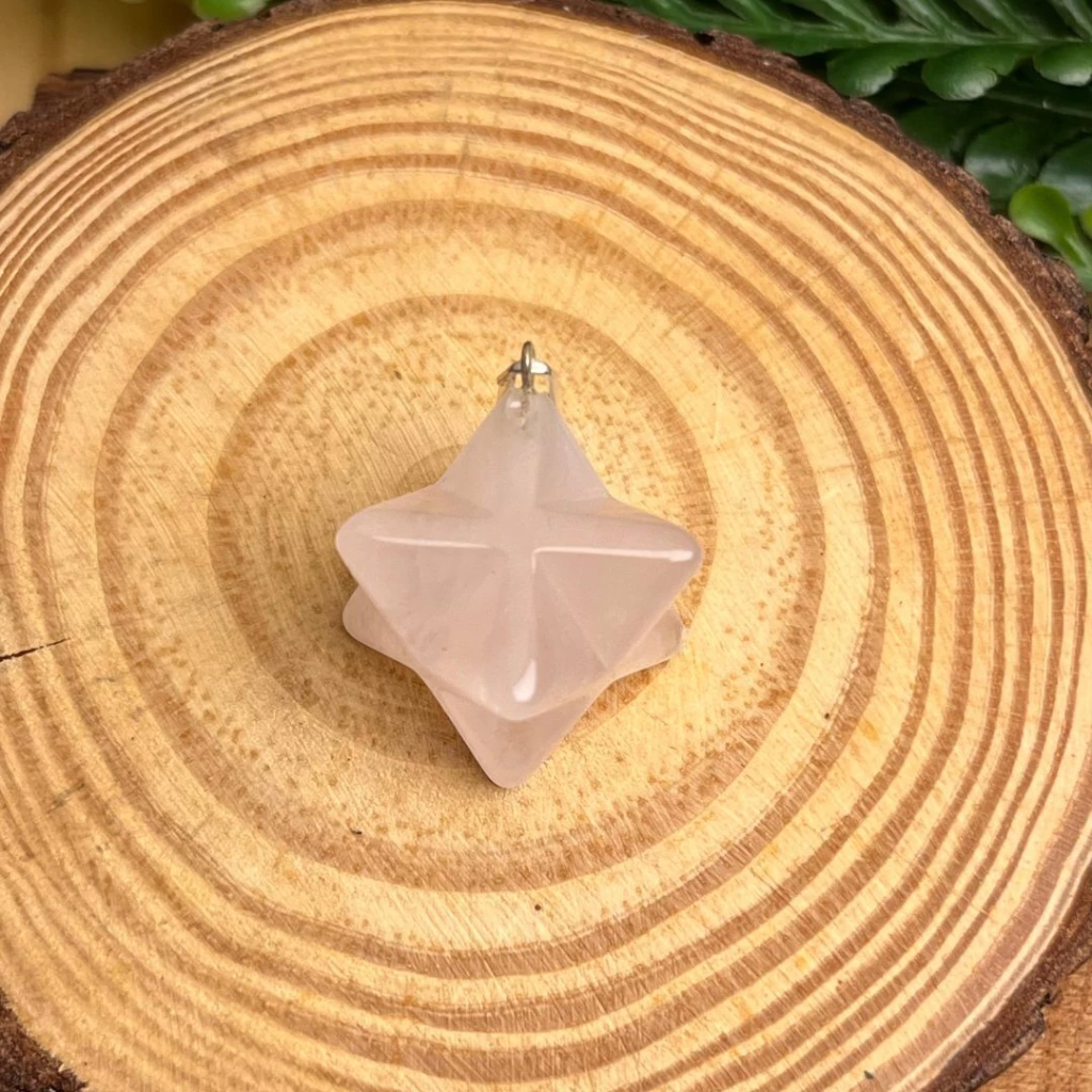 Amor em estado de expansão. O Pingente Merkabah de Quartzo Rosa une a vibração do amor com o poder da geometria sagrada. A forma Merkabah ativa o equilíbrio entre corpo, mente e espírito, enquanto o Quartzo Rosa trabalha a cura emocional, o amor próprio e o acolhimento.