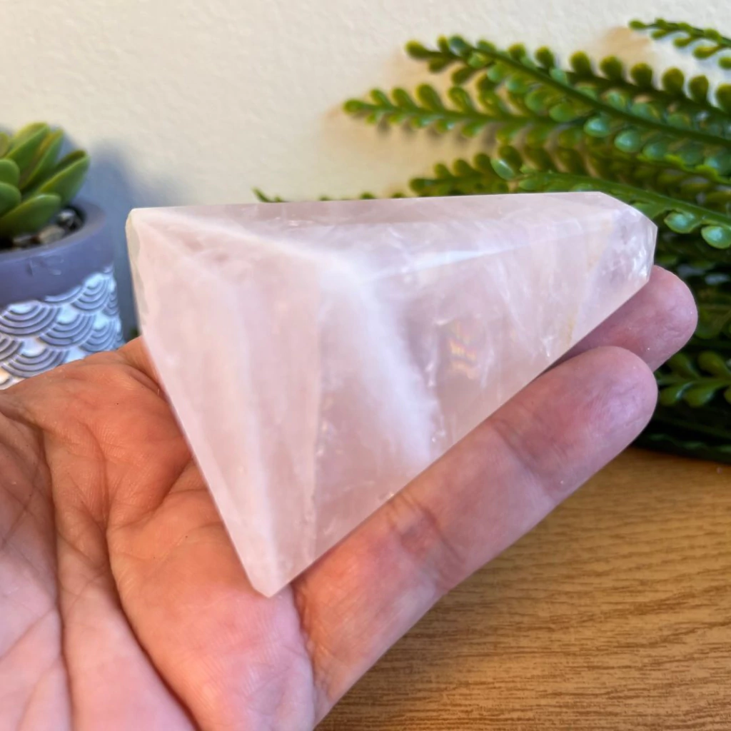 A Pirâmide Ponta de Quartzo Rosa é uma peça única esculpida com quatro faces, combinando o formato de ponta com a presença energética de uma pirâmide. Esse design direciona e amplia a vibração do cristal, tornando a peça ideal para harmonizar ambientes e fortalecer práticas espirituais.
