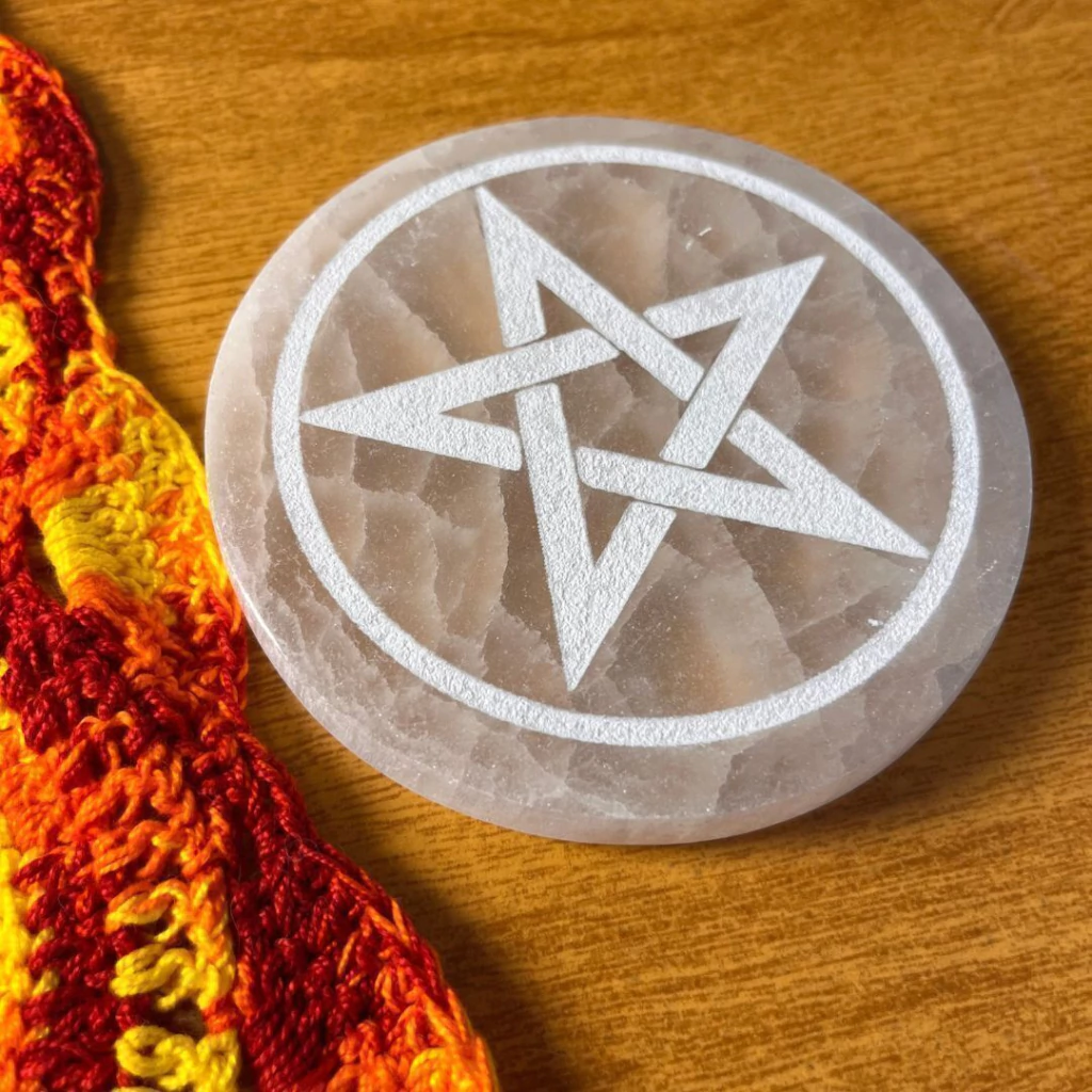 A Placa de Selenita com Pentagrama é uma poderosa ferramenta de purificação e proteção energética. A Selenita é uma pedra conhecida por limpar e recarregar a energia de pessoas, cristais e ambientes, dissipando qualquer negatividade e restaurando a harmonia. O Pentagrama, símbolo sagrado que representa os cinco elementos, terra, ar, fogo, água e espírito e potencializa ainda mais o poder espiritual e a conexão com as forças da natureza.