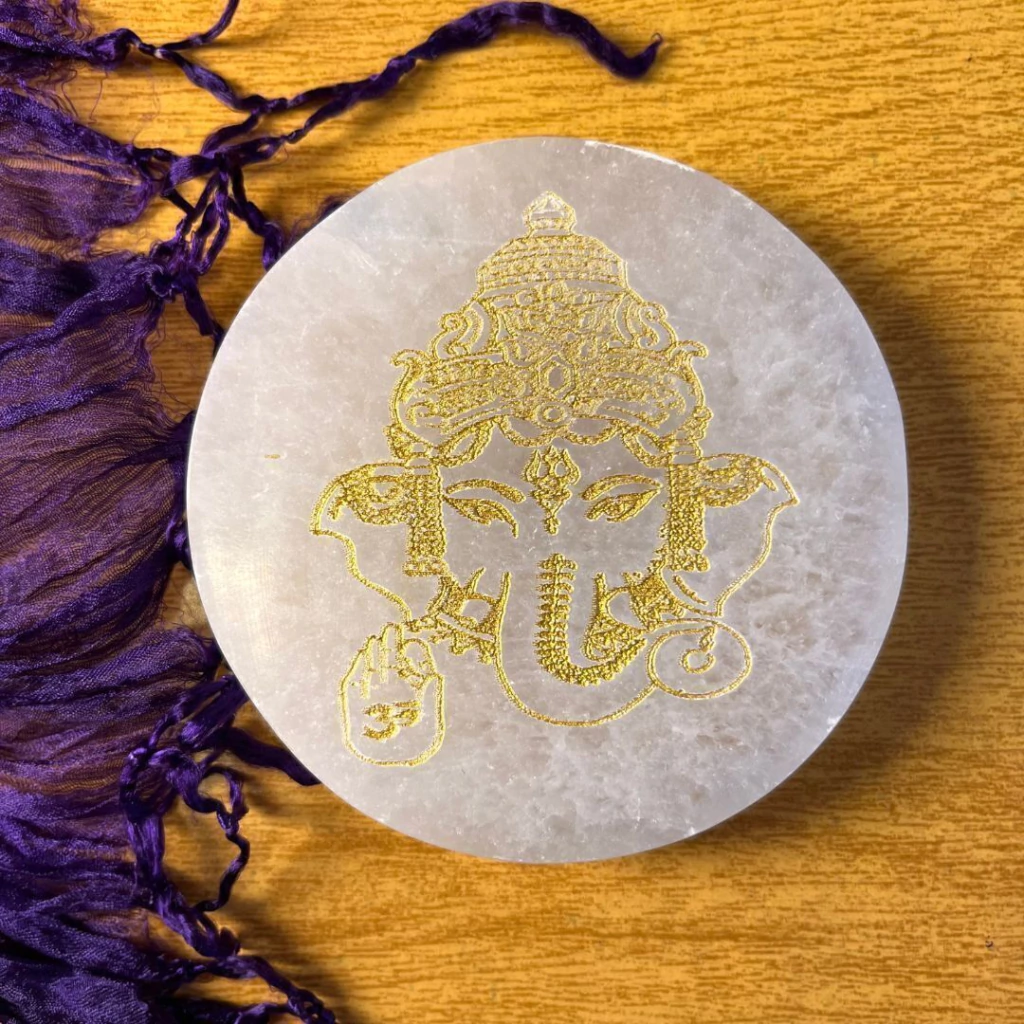 A Placa de Selenita com Ganesha é um símbolo de purificação, prosperidade e novos começos. A Selenita, pedra da limpeza e da elevação espiritual, atua removendo energias densas e equilibrando o campo energético, enquanto o rosto de Ganesha, o Deus hindu conhecido por abrir caminhos e afastar obstáculos, potencializa essa vibração de prosperidade, proteção e sabedoria.