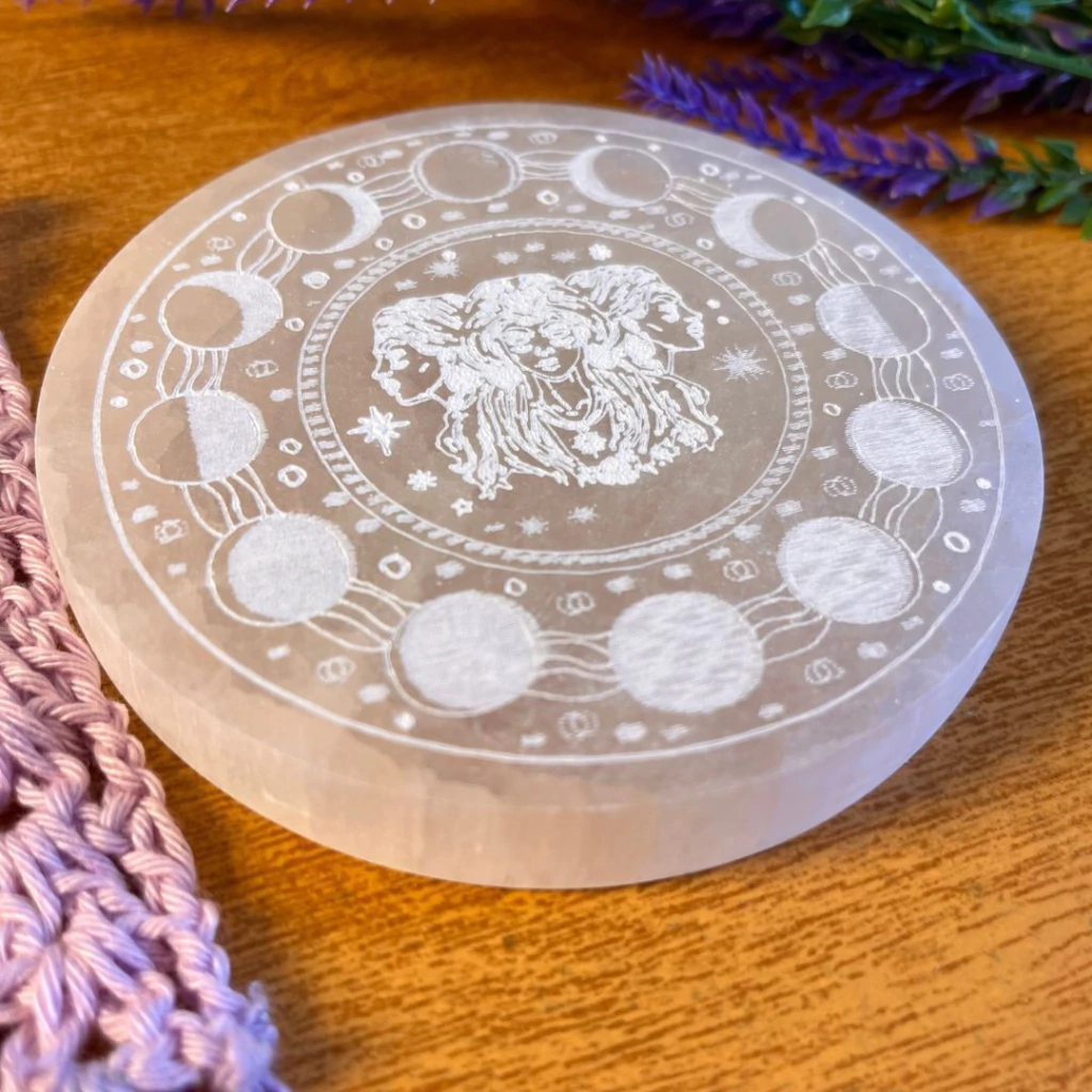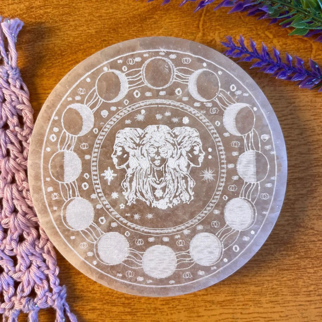 A Placa de Selenita Hécate une a força ancestral da Deusa Tríplice com a pureza luminosa da selenita, criando uma peça de proteção, sabedoria e renascimento energético. Hécate, guardiã das encruzilhadas, da magia e dos mistérios, representa o ciclo completo da vida: donzela, mãe e anciã, passado, presente e futuro em perfeita harmonia. Ao lado das Fases da Lua, esse símbolo desperta intuição, poder pessoal e clareza para decisões importantes.