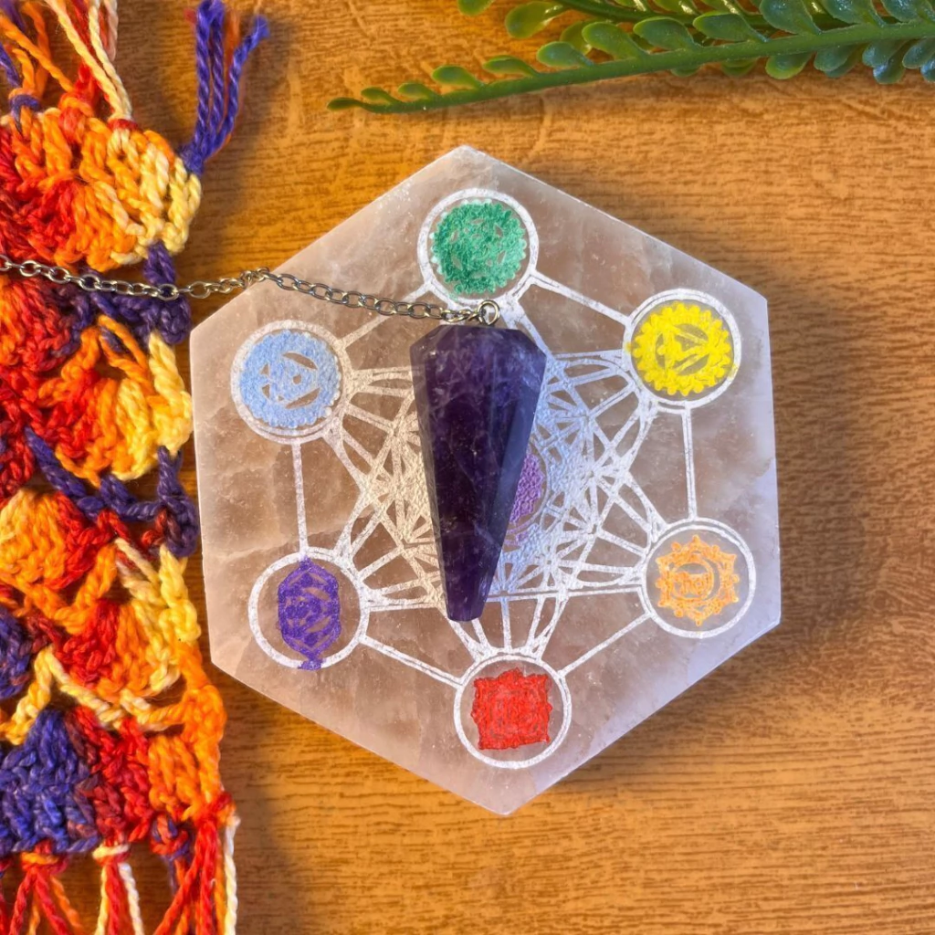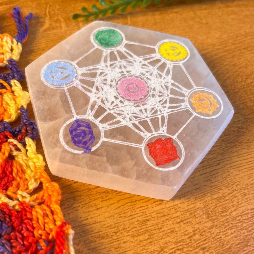 Essa placa de Selenita une a energia da Selenita, a força do Metatron ao equilíbrio dos chakras, criando uma peça que trabalha limpeza, proteção e harmonização do corpo energético ao mesmo tempo. Os símbolos coloridos dos chakras ativam cada centro energético, trazendo mais vitalidade, presença e fluidez emocional.